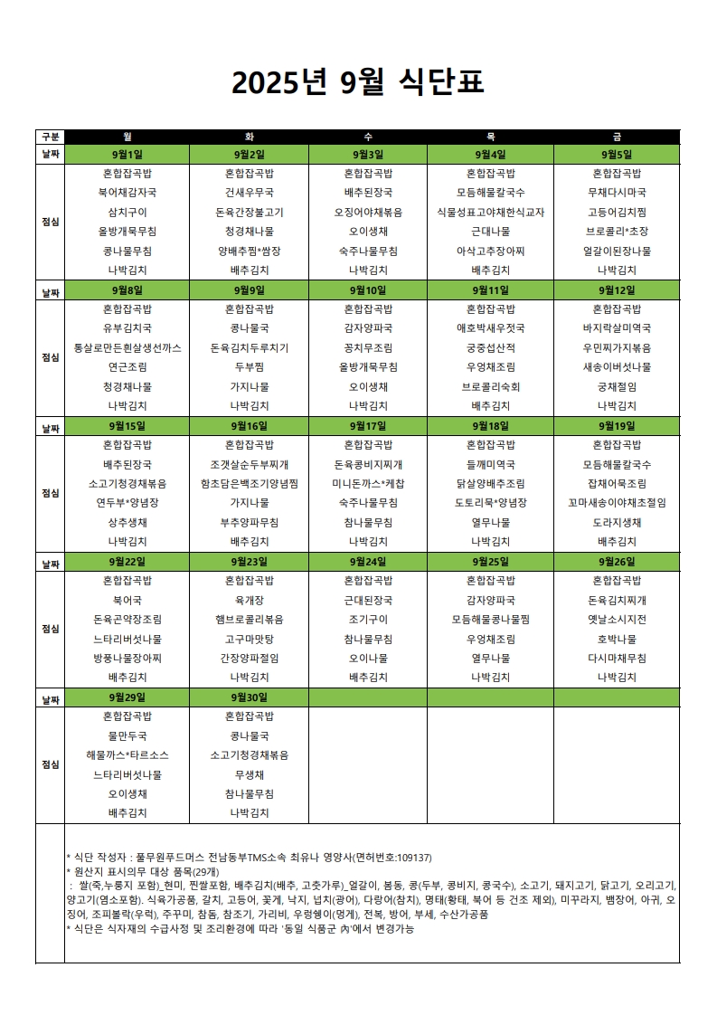 [건강밥상] 9월 식단표