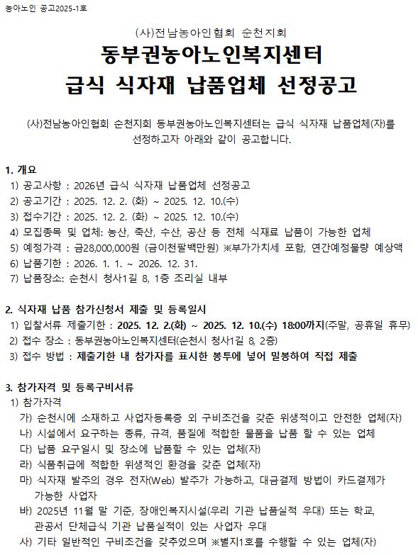 [농아노인복지센터] 급식 식자재 납품업체 선정 공고